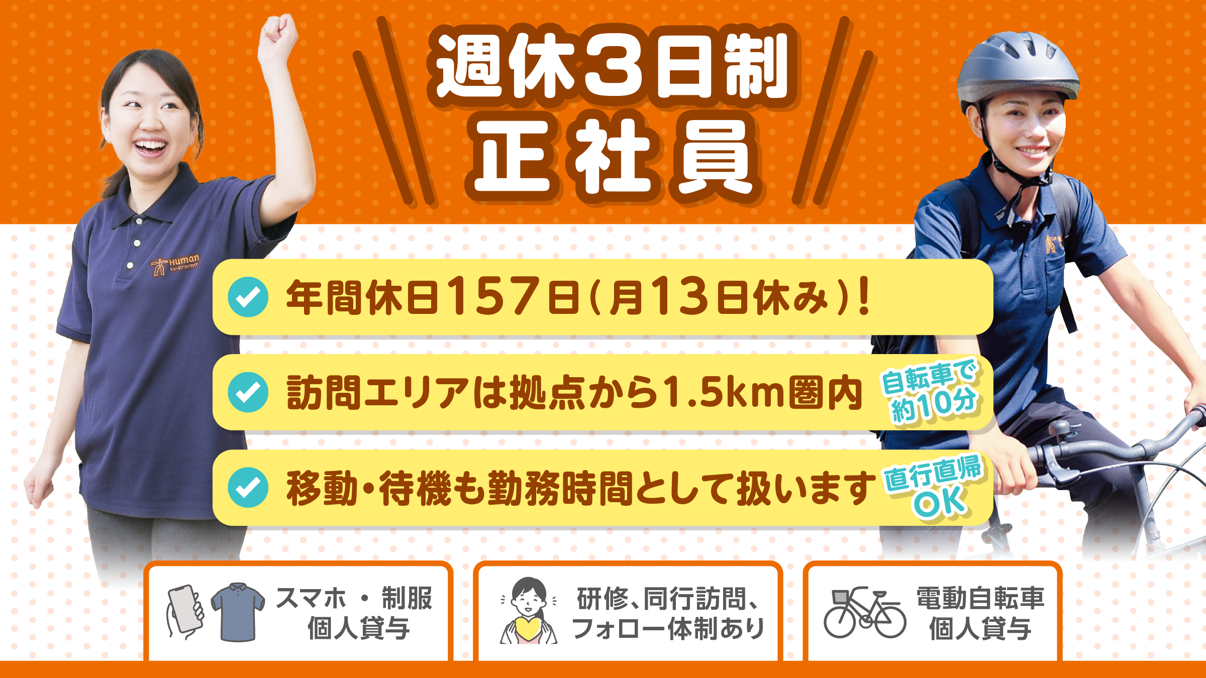 | 仕事内容 | ご利用者様のご自宅を訪問し、身体介護や生活援助を行う訪問介護のお仕事です。 訪問先は拠点から1.5km圏内(電動自転車で約10分)が中心のため、移動の負担も少ない環境です。 介護記録はスマートフォンで入力するため、事務作業も勤務時間内で完結します。 【主なお仕事内容】 【1日の流れ】※一例 【働くポイント】 |