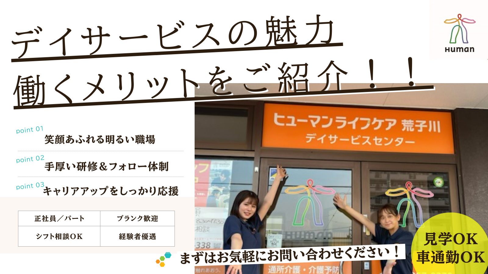 仕事内容 | ヒューマンライフケアのデイサービスでは、地域の高齢者が安心して笑顔で過ごせる毎日をサポートしています。 ・相談援助、契約手続き・重要事項の説明 ※記録や勤怠管理は専用アプリで効率化 【ヒューマンライフケアの魅力】 「笑顔」と「こころ」―― |