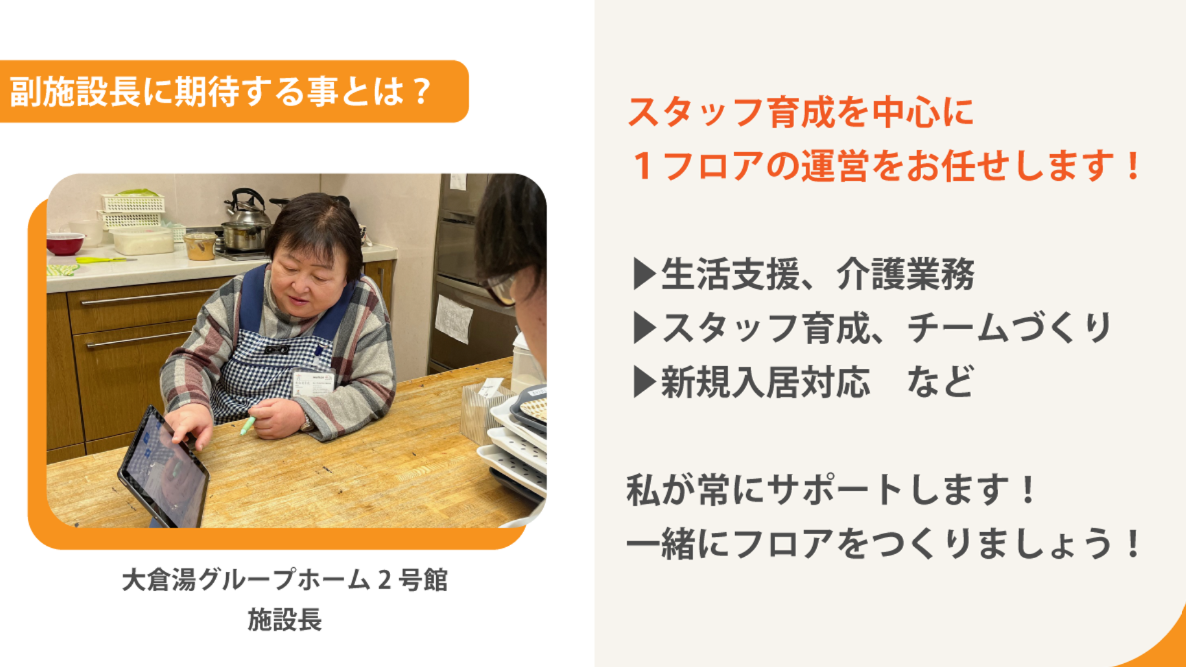 | 仕事内容 | 大倉湯グループホーム2号館では、 副施設長は、施設長の右腕として 入社後は、まず現場の一員として業務に入り マネジメントの経験は問いません。 【主な業務内容】 ■ 現場業務 ■スタッフのマネジメント ■新規スタッフのマネジメント 2号館には、ベテランから新人まで幅広いスタッフが在籍しています。 ■ 運営サポート/施設長フォローのもとお任せします 現場を理解し、職員一人ひとりの状況を把握しながら 副施設長としての経験を通じて |